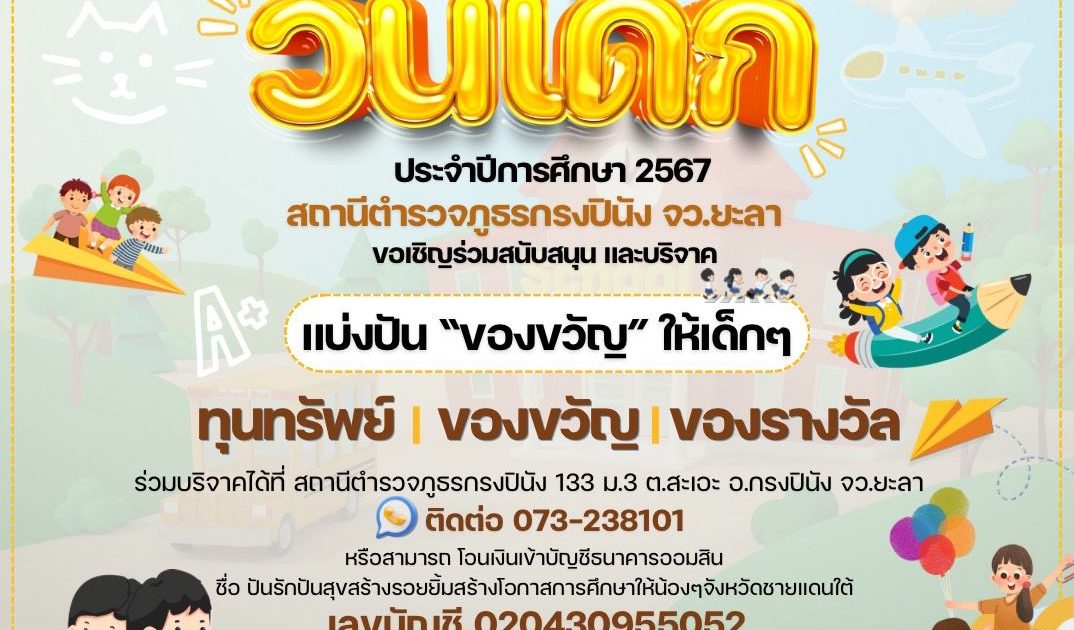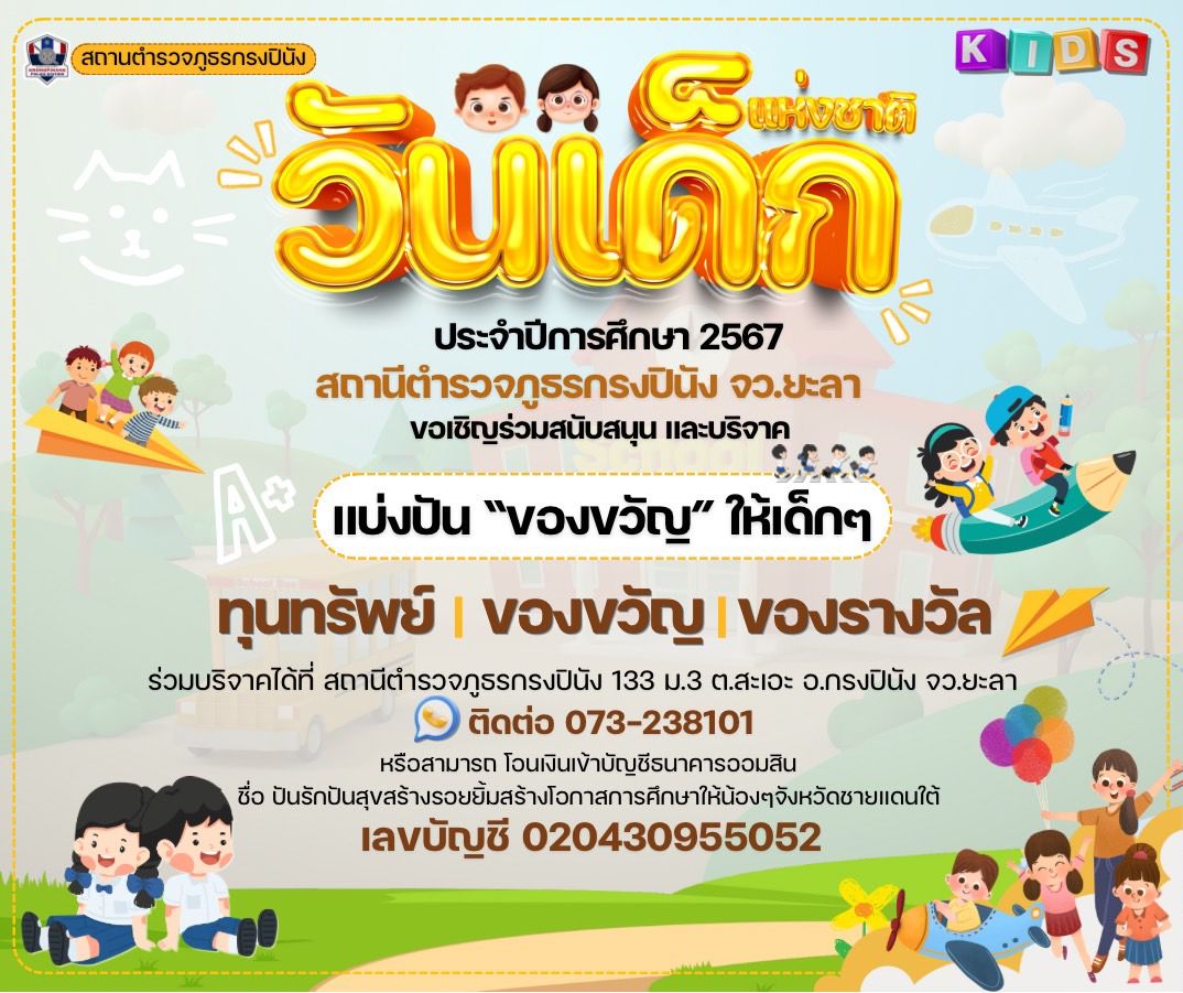 ร่วมสนับสนุนทุนการศึกษา ของรางวัล ของขวัญ อาหาร ขนม อุปกรณ์การเรียน และสิ่งของต่าง ๆ เพื่อจัดกิจกรรมวันเด็กให้แก่น้อง ๆ ในพื้นที่ อำเภอกรงปินัง จว.ยะลา สามารถร่วมส่งของขวัญ ทุนการศึกษาเพื่อใช้ในการจัดกิจกรรมวันเด็กได้ที่ ![]()