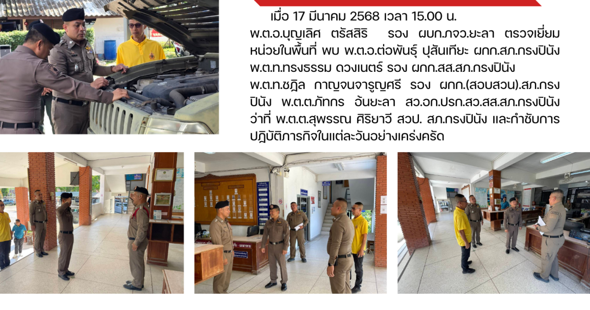 – พ.ต.อ.บุญเลิศ ตรัสสิริ รอง ผบก.ภจว.ยะลา ตรวจเยี่ยมหน่วยในพื้นที่ พบ พ.ต.อ.ต่อพันธุ์ ปุสันเทียะ ผกก.สภ.กรงปินัง พ.ต.ท.ทรงธรรม ดวงเนตร์ รอง ผกก.สส.สภ.กรงปินัง พ.ต.ท.ชฏิล กาญจนจารูญศรี รอง ผกก.(สอบสวน).สภ.กรงปินัง พ.ต.ต.ภัทกร อ้นยะลา สว.อก.ปรก.สว.สส.สภ.กรงปินังว่าที่ พ.ต.ต.สุพรรณ ศิริยาวี สวป. สภ.กรงปินัง และกำชับการปฏิบัติภารกิจในแต่ละวันอย่างเคร่งครัด
