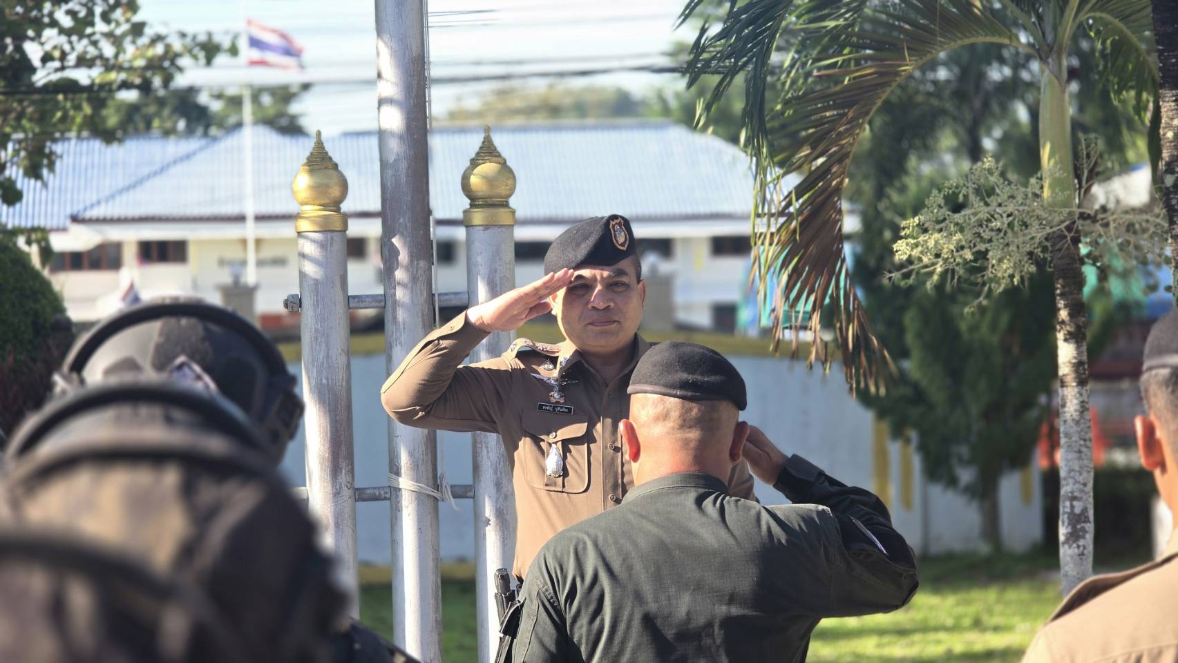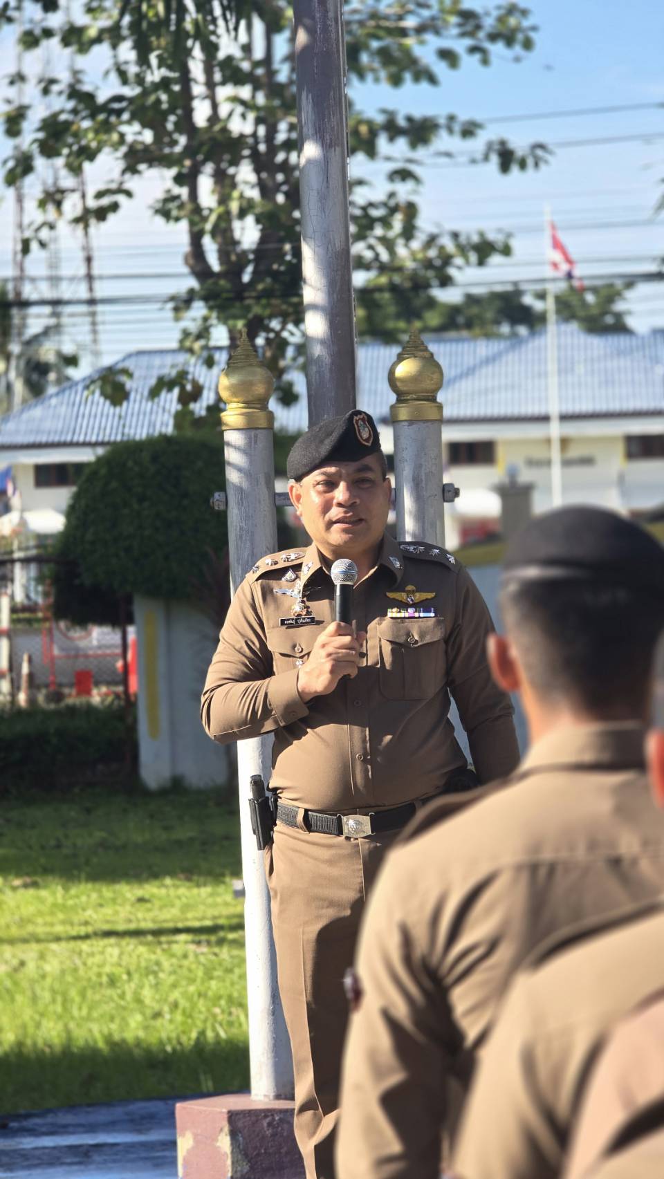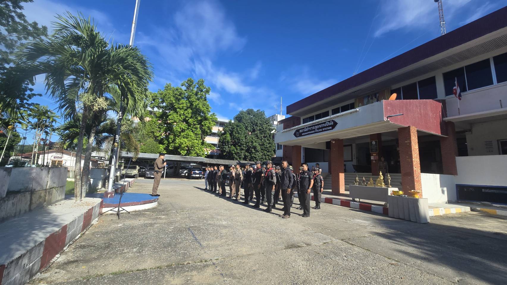 ว่าที่ พ.ต.อ.ต่อพันธุ์ ปุสันเทียะ ผกก.สภ.กรงปินัง ,พ.ต.ท.ทรงธรรม ดวงเนตร์ รอง ผกก.สส.สภ.กรงปินัง ,พ.ต.ท.ศุภโชค สระศรี รอง ผกก.ป.สภ.กรงปินัง ,ว่าที่ พ.ต.ท.ภัทกร อ้นยะลา สว.อก.สภ.กรงปินัง ,ว่าที่ พ.ต.ต.ชานนท์ ทองเพชร สว.สส.สภ.กรงปินัง ,ร.ต.อ.วิโรจน์ นนมะเสน รอง สวป.สภ.กรงปินัง ,ร.ต.ต.สุรพัฒน์ สงเคราะห์ พร้อมข้าราชการตำรวจ ร่วมเข้าแถวแสดงความเคารพธงชาติ, กล่าวคำสัตย์ปฎิญาณ, กล่าวอุคมคติของตำรวจ