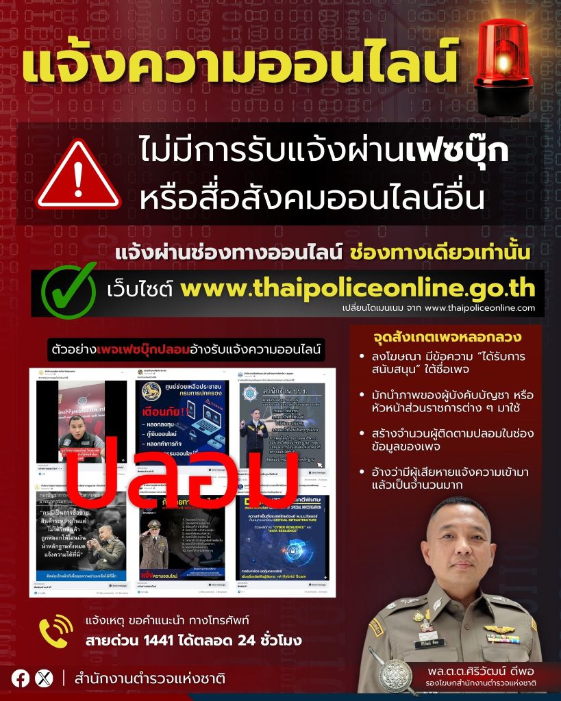 แจ้งความออนไลน์ 29 กุมภาพันธ์ 2567 โดย ADMIN_PINANG / ข่าวประชาสัมพันธ์ วันที่ 3 ม.ค.67จุดสังเกตุเพจหลอกลวง 1.ลงโฆษณา มีข้อความ ” ได้รับการสนับสนุน ” ใต้ชื่อเพจ 2.มักนำภาพของผู้บังคับบัญชา หรือหัวหน้าส่วนราชการต่างๆ มาใช้ 3.สร้างจำนวนผู้ติดตามปลอมในช่องข้อมูลของเพจ 4.อ้างว่ามีผู้เสียหายแจ้งความเข้ามาแล้วเป็นจำนวนมาก#สำนักงานตำรวจแห่งชาติ FacebookFacebookXXLINELine
