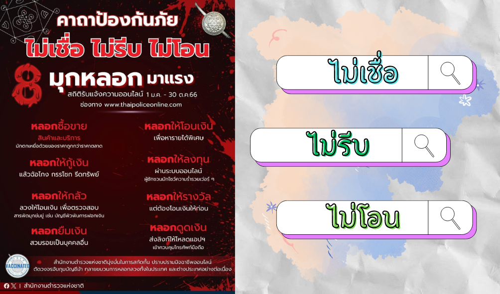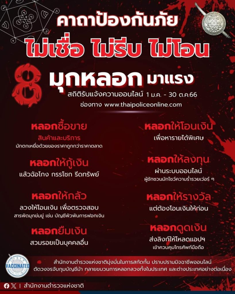 เผยแพร่เมื่อ 1 พ.ย.66 แจกคาถาป้องกันภัย ” ไม่เชื่อ ไม่รีบ ไม่โอน “รู้ทันมิจฉาชีพออนไลน์กับ 8 มุกหลอกมาแรงสำนักงานตำรวจแห่งชาติสืบสวนปราบปรามมิจฉาชีพออนไลน์อย่างต่อเนื่อง เพื่อสกัดกั้น ปราบปราม ตัดวงจร ขยายผล ทั้งในประเทศ และต่างประเทศเป็นไปตามนโยบายเน้นหนักของ “พล.ต.อ.ต่อศักดิ์ สุขวิมล ผบ.ตร.” ที่กำชับให้มีมาตรการ และปฏิบัติการป้องกันปราบปราบอาชญากรรมทางเทคโนโลยี ที่สร้างความเดือดร้อนให้พี่น้องประชาชนทุกมิติ แต่มิจฉาชีพก็ยังพยายามใช้กลอุบายสารพัดรูปแบบเพื่อหลอกลวงประชาชน หนึ่งในมาตรการป้องกันที่สำคัญ คือสร้างการรับรู้ ให้ประชาชนมีเกราะป้องกัน เป็น #วัคซีนไซเบอร์ ให้รู้เท่าทันกลลวงหลายรูปแบบ ซึ่งจากสถิติการรับ #แจ้งความออนไลน์ ทาง www.thaipoliceonline.com ตั้งแต่ 1 มกราคม – 30 ตุลาคม 2566 พบ 8 รูปแบบการหลอกลวง ที่สร้างความเสียหาย 8 อันดับแรก จากสถิติพบว่าการหลอกลวงซื้อขายสินค้าทางออนไลน์ทั้งรูปแบบเป็นขบวนการ และไม่เป็นขบวนการ เป็นภัยออนไลน์อันดับ 1 มีผู้เสียหายจำนวนมาก และยังมีการหลอกลงทุนรูปแบบต่าง ๆ สร้างแพลตฟอร์มปลอมมาหลอกลวง แก๊งคอลเซ็นเตอร์หลอกให้กลัว หลอกให้กู้เงิน หลอกทำงานพิเศษแต่ต้องโอนเงินให้ ฯลฯ