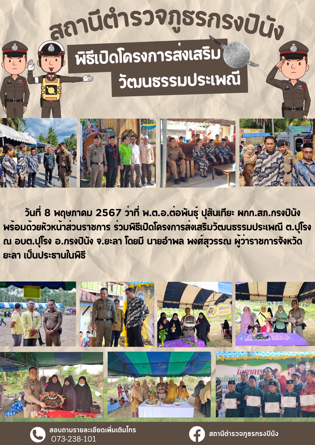 ‼️พิธีเปิดโครงการส่งเสริมวัฒนธรรมประเพณี‼️ 8 พฤษภาคม 2567 โดย ADMIN_PINANG / ข่าวภารกิจผู้บังคับบัญชา พิธีเปิดโครงการส่งเสริมวัฒนธรรมประเพณี วันที่ 8 พฤษภาคม 2567 เวลา 14.30 น. ว่าที่ พ.ต.อ.ต่อพันธุ์ ปุสันเทียะ ผกก.สภ.กรงปินัง พร้อมหัวหน้าส่วนราชการ ร่วมพิธีเปิดโครงการส่งเสริมวัฒนธรรมประเพณี ต.ปุโรง ณ อบต.ปุโรง อ.กรงปินัง จ.ยะลา โดยมี นายอำพล พงศ์สุวรรณ ผู้ว่าราชการจังหวัดยะลา เป็นประธาน FacebookFacebookXXLINELine